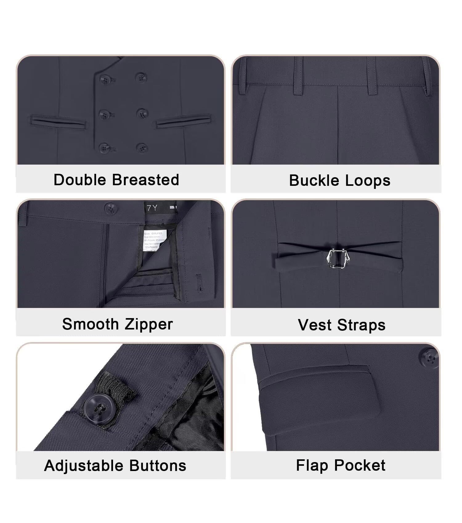 - Material:The Boys Suit Fit Slim suit is Made With 100%Polyester.Fabric breathable comfortable, not easy to fold, suitable for all year round wear.This boys' suit ensemble comprises a suit jacket, pants, a vest, creating a complete and coordinated outfit suitable for any occasion.