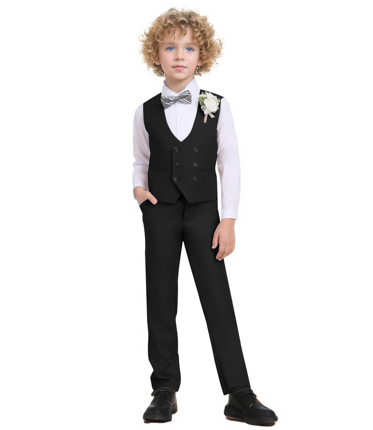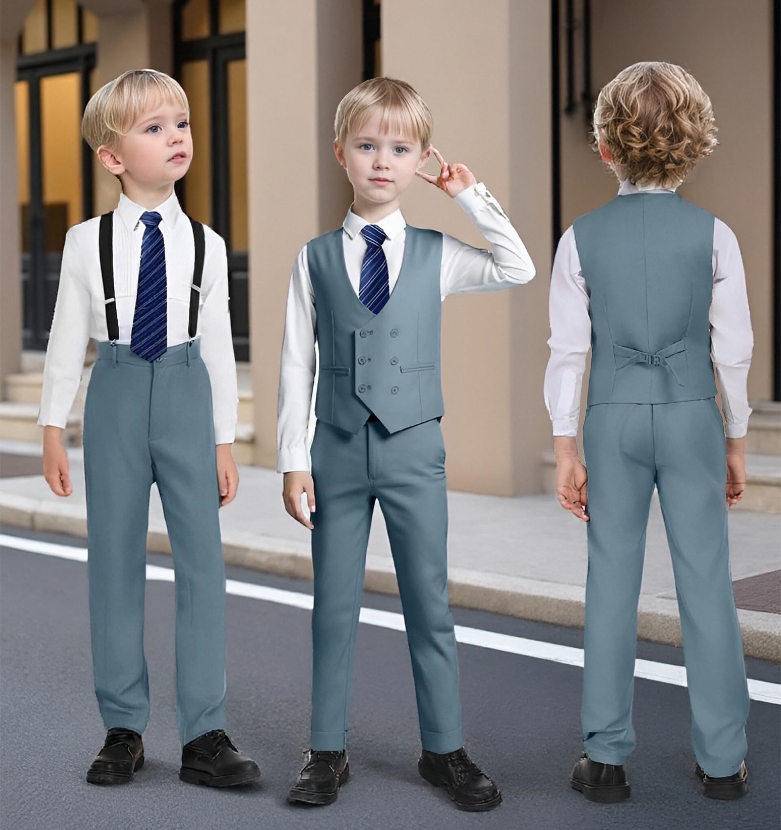 - 【Material】4PC boy suits:Vest+Pant+shirt+bow tie,5 PC boy suits: Blazer+Vest+Pant+shirt+tie(5pc suit has an additional suit jacket compared to the 4pc.this boys' suit offers a luxurious textured finish—soft, breathable, and fashion for all-day comfort during formal events.is the best gift for your children!